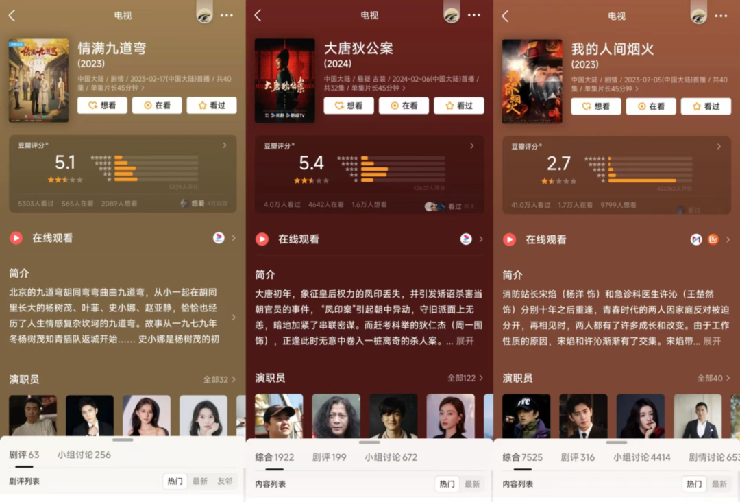 電視劇上,中國(guó)儒意2023年上線了《情滿九道灣》、《大唐狄公案》、《我的人間煙火》三部劇集,對(duì)應(yīng)豆瓣評(píng)分5.1分、5.4分、2.7分,可以說打破了以往業(yè)內(nèi)對(duì)其高口碑的期待。