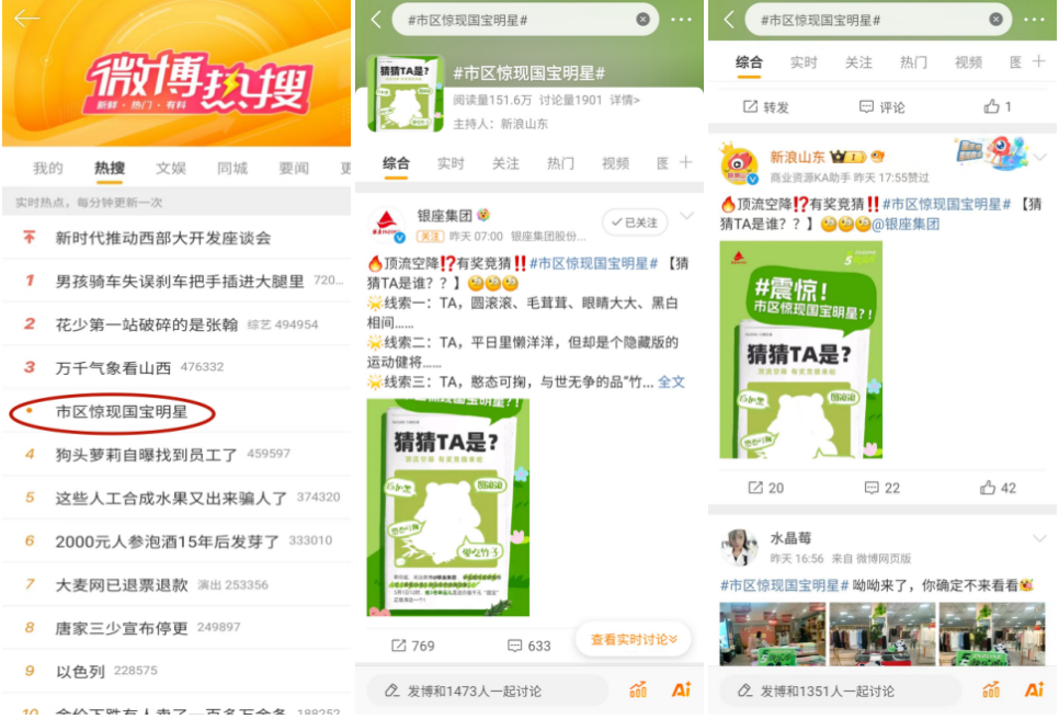 4月25日#市區(qū)驚現(xiàn)國(guó)寶明星#話題沖上熱搜,頂流空降銀座引發(fā)全網(wǎng)討論!微博熱度霸榜第三,截至4月25日12時(shí)02分參與互動(dòng)量已達(dá)151萬(wàn)!