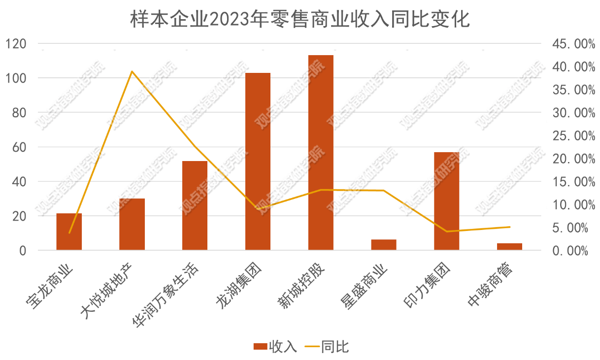輕資產(chǎn)輸出為主的企業(yè)中,頭部的華潤萬象生活營收和增幅均為樣本中最高的,2023年旗下在營購物中心實現(xiàn)零售額1812億元,平均每天進(jìn)賬約5億元,同比增長43.3%。