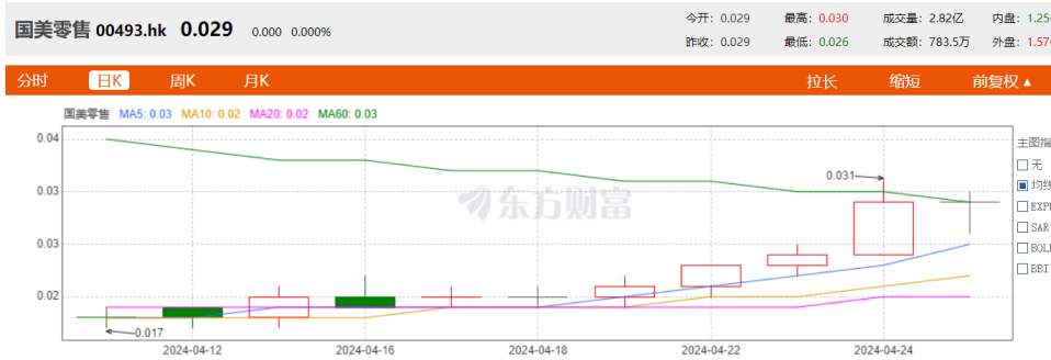 4月22日起,國美零售(00493.HK)股價開始上漲,4月24日漲幅最高超20%。