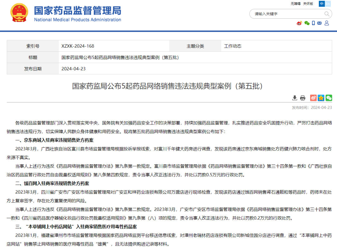 就在近日,國(guó)家藥監(jiān)局公布了第五批藥品網(wǎng)絡(luò)銷售違法違規(guī)典型案例,其中包括了京東、美團(tuán)入駐商家。