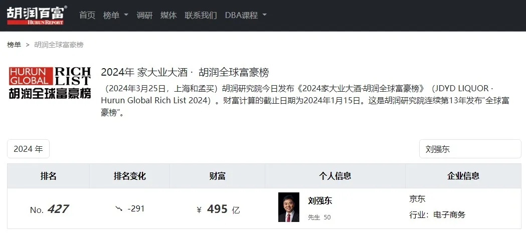 今年3月,胡潤研究院發(fā)布的《2024胡潤全球富豪榜》中,劉強(qiáng)東以495億人民幣的財(cái)富排名427,與去年相比,排名下降了291位,財(cái)富縮水將近一半。
