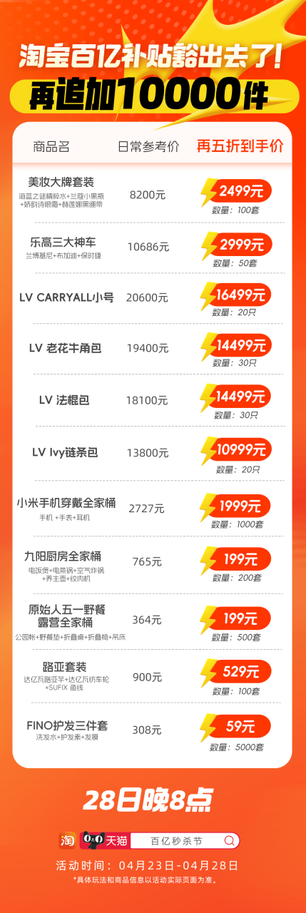 4月26日,淘寶“百億秒殺節(jié)”宣布再度加碼,全網(wǎng)低價的硬通貨追加10000件。