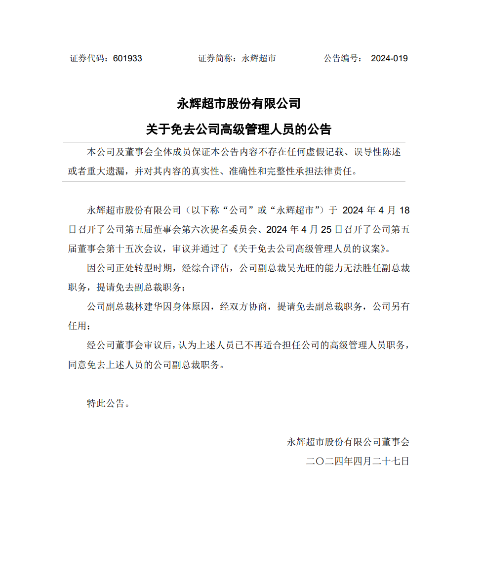 公告顯示,經(jīng)永輝董事會審議,吳光旺、林建華已不再適合擔任公司的高級管理人員職務(wù),同意免去上述人員的公司副總裁職務(wù)。