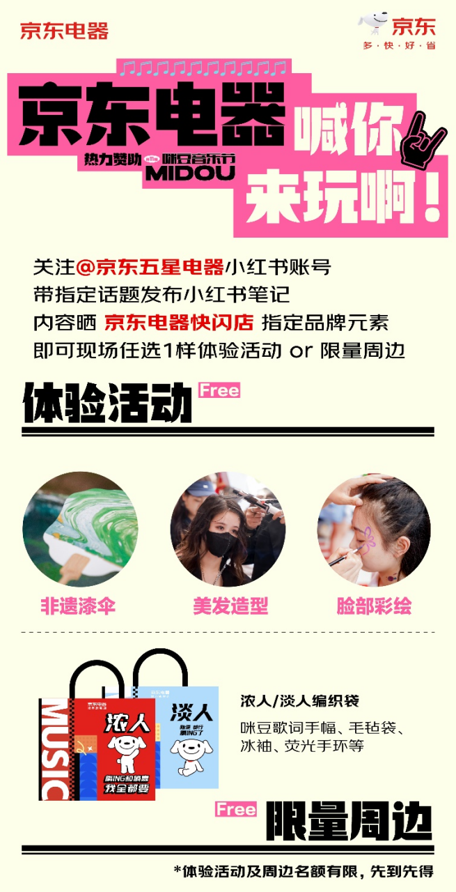 在5月1日至3日期間,前往咪豆音樂(lè)節(jié)的樂(lè)迷們均可來(lái)京東電器“一站式躺贏”快閃店互動(dòng)游玩。掃碼關(guān)注“京東五星電器”官方小紅書(shū),并帶話題發(fā)布原創(chuàng)筆記(具體規(guī)則以現(xiàn)場(chǎng)引導(dǎo)公告為準(zhǔn)),就可得到定制濃人/淡人編織袋、向偶像表達(dá)“愛(ài)”的歌詞手幅、防暑冰袖等等定制周邊,或選擇參與非遺漆傘、美發(fā)造型、臉部彩繪等互動(dòng)體驗(yàn),“靚翻”朋友圈,“躺贏”五一。