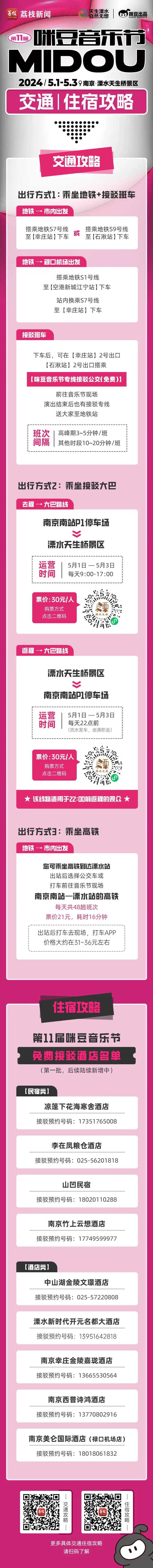 此次咪豆音樂(lè)節(jié)舉辦場(chǎng)地為南京溧水天生橋景區(qū),前往現(xiàn)場(chǎng)的歌迷們,可以參考以上交通攻略。參考往期情況,演出日11:00過(guò)后停車場(chǎng)車位就相當(dāng)緊張,選擇自駕的樂(lè)迷,建議提前出發(fā);多備一件厚外套,早晚溫差較大;本屆咪豆采取實(shí)名制驗(yàn)票,務(wù)必記得帶身份證。