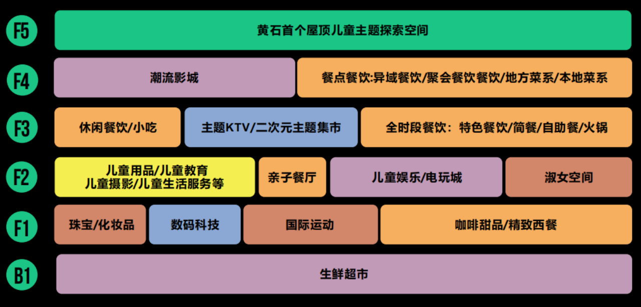 項(xiàng)目體量約8萬方(停車場(chǎng)配置有地下1008個(gè)停車位、地面200個(gè)停車位),商業(yè)樓層包含地下二層,地上四層,連接黃石第一高度甲級(jí)寫字樓。打造以“區(qū)域潮流商業(yè)中心”、“都市森活公園”為標(biāo)簽的特色生活方式聚會(huì)中心。圍繞主力店(26%)、次主力店(10%)、餐飲(32%)、零售(15%)、體驗(yàn)配套(10%)、兒童(7%)的業(yè)態(tài)占比,緊扣趣活主題,通過餐飲和娛樂體驗(yàn)業(yè)態(tài)的全樓層分布,制定優(yōu)勢(shì)業(yè)態(tài)帶動(dòng)垂直空間的招商及經(jīng)營(yíng)策略,以填補(bǔ)湖北省黃石市國(guó)家級(jí)開發(fā)區(qū)的商業(yè)空白,成為黃石遠(yuǎn)景規(guī)劃目標(biāo)都市主中心城區(qū)的商業(yè)排頭兵。
