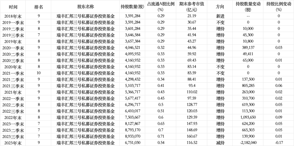 2018年四季度,瑞豐匯邦首次出現(xiàn)在貴州茅臺的前十大流通股東之列,持股359.13萬股,參考市值約21.19億元。時代周報記者梳理發(fā)現(xiàn),在持股貴州茅臺期間,瑞豐匯邦曾16次增持。持倉市值巔峰出現(xiàn)在2023年三季度末,當(dāng)時,瑞豐匯邦持股893.31萬股,參考市值約160.67億元。