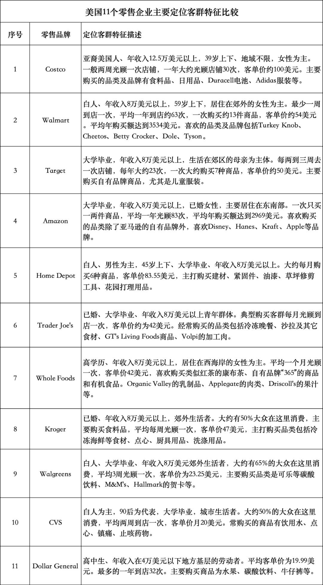 美國消費者一年當中到大型零售店購物1次以上的人群非常多。將顧客的購買行為特征匯總起來形成充分數據,經過仔細分類和辨識,構成每個零售商的典型定位客群。