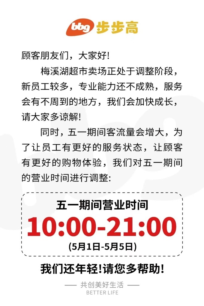 根據(jù)步步高超市梅溪湖店發(fā)布的公告顯示,賣場目前正處于調(diào)整階段,新員工較多,專業(yè)能力還不成熟,服務(wù)會有不周到的地方,會加快成長,請消費者諒解。同時將五一期間的營業(yè)時間調(diào)整為10:00-21:00,以便讓員工有更好的服務(wù)狀態(tài),讓顧客有更好的購物體驗。