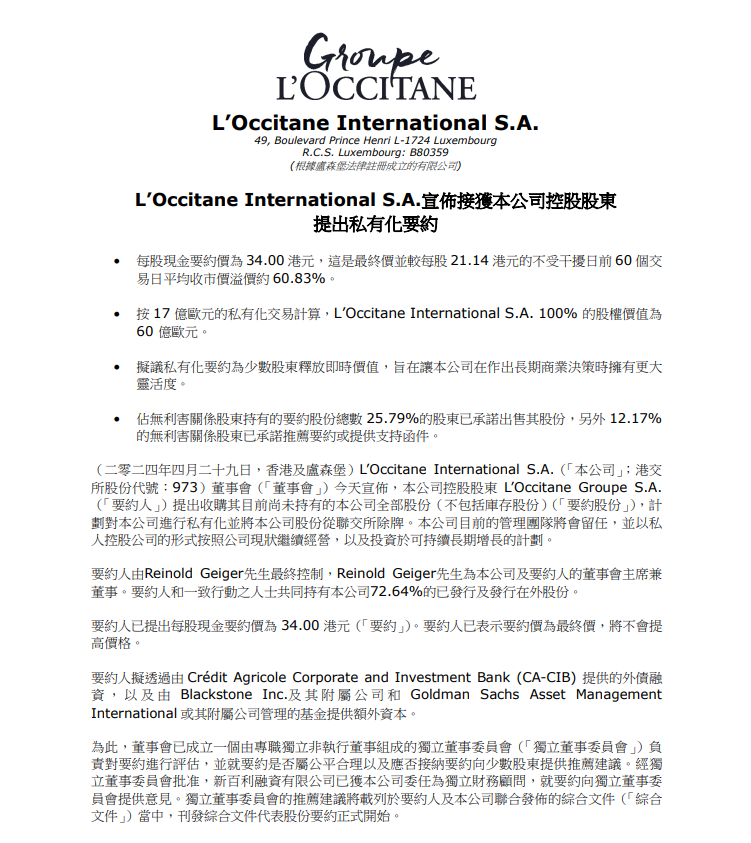 歐舒丹私有化后,
