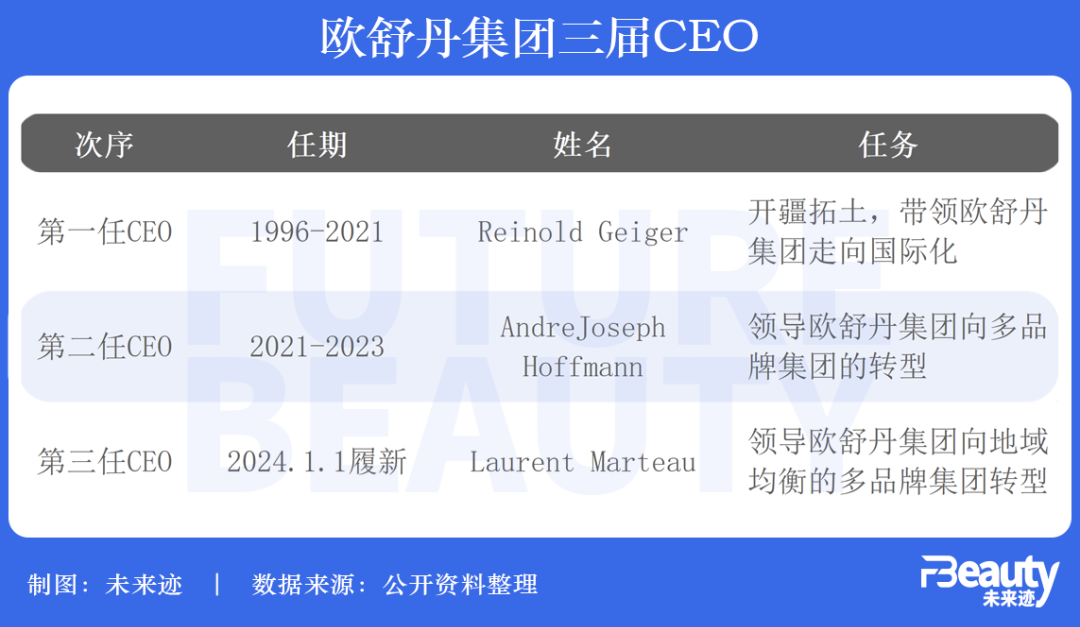 至此,歐舒丹集團(tuán)自成立以來已經(jīng)迎來第三任CEO,而在安德烈·霍夫曼(Andre Joseph Hoffmann)離任、Laurent Marteau上任之時(shí),首任CEO Reinold Geiger仍然是集團(tuán)主席。