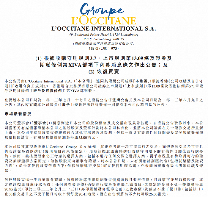 歐舒丹2023年8月份關(guān)于恢復(fù)交易的公告