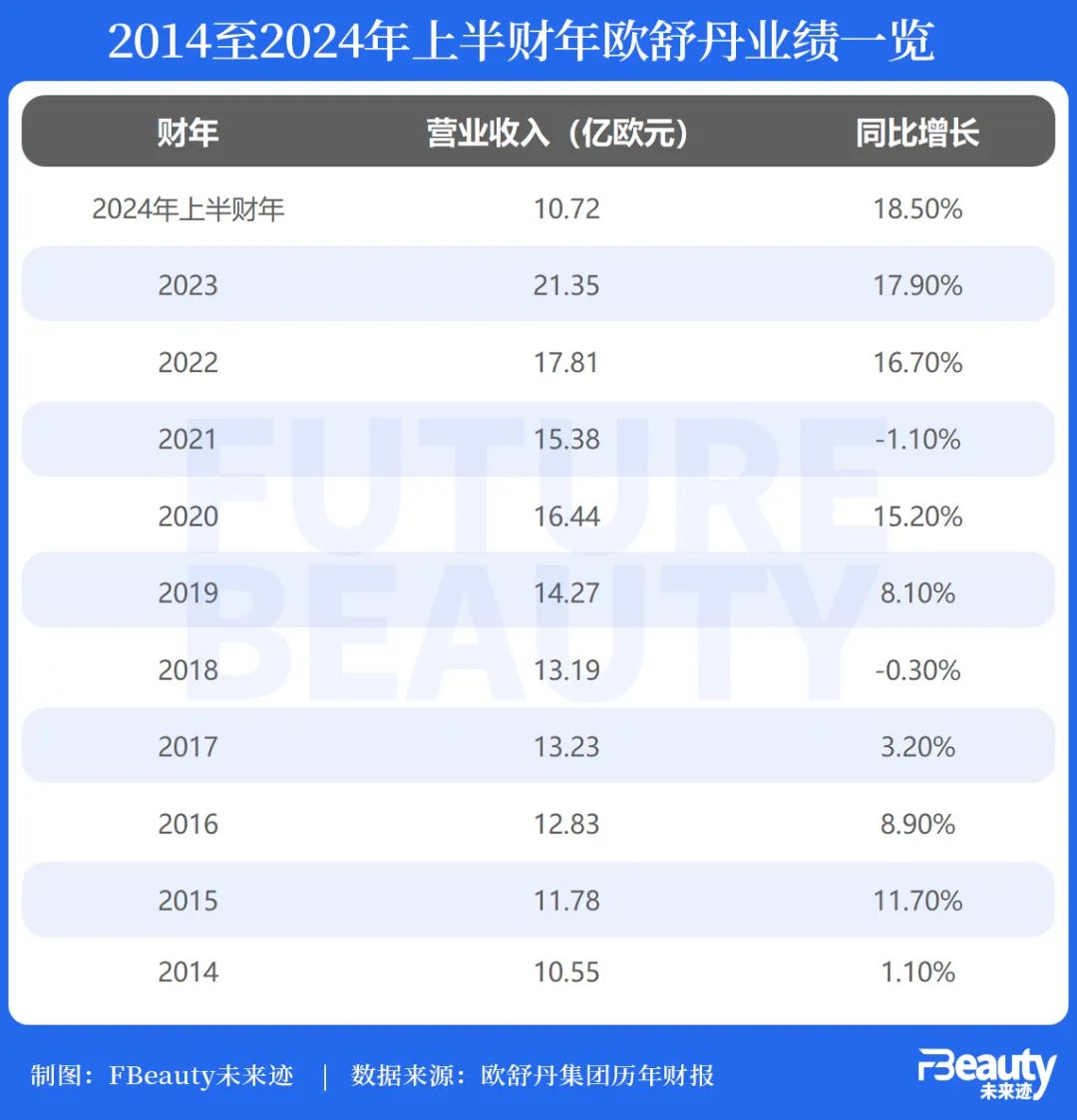 財(cái)報(bào)數(shù)據(jù)顯示,歐舒丹在2014年至2024年上半財(cái)年間的營業(yè)收入基本保持平穩(wěn)上升趨勢(shì),除了2021年略微下滑之外,2023年更是首次錄得超20億歐元營收的好成績(jī)。