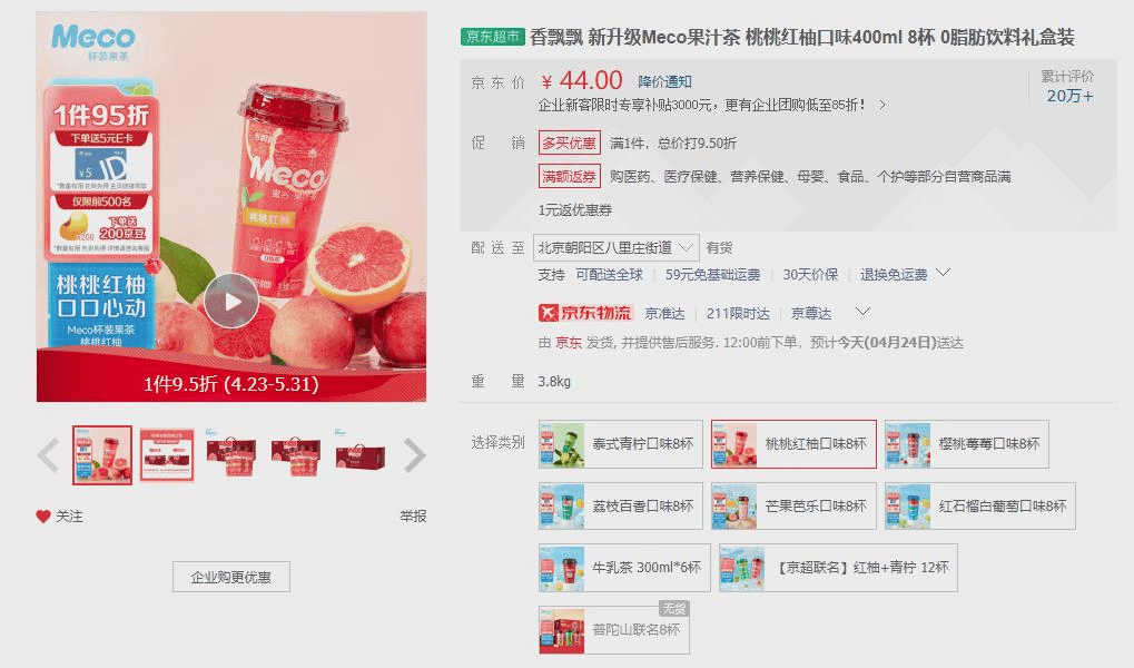 或許也正是因為利潤不佳,香飄飄對創(chuàng)新似乎并不是很熱衷。還是以Meco果汁茶為例,盡管香飄飄將其視作是獨家開創(chuàng)的新品類,可自2018年推出之后,至今在京東旗艦店也只有8種口味在售,“芒果芭樂”成為熱賣口味,都會被寫進財報作為公司持續(xù)推進“產(chǎn)品口味創(chuàng)新”的案例。