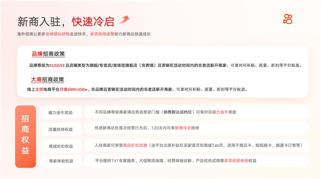 在此次活動上,快手電商跨境行業(yè)面向商家推出品牌招商和大商招商兩項扶持政策。針對品牌商家,品牌等級為S1/S2/S3,店鋪類型為旗艦/專賣店/賣場型旗艦店(含跨境),且首銷在活動時間內的非老店新開商家,可獲得平臺提供的相應補貼、流量、折扣等權益。