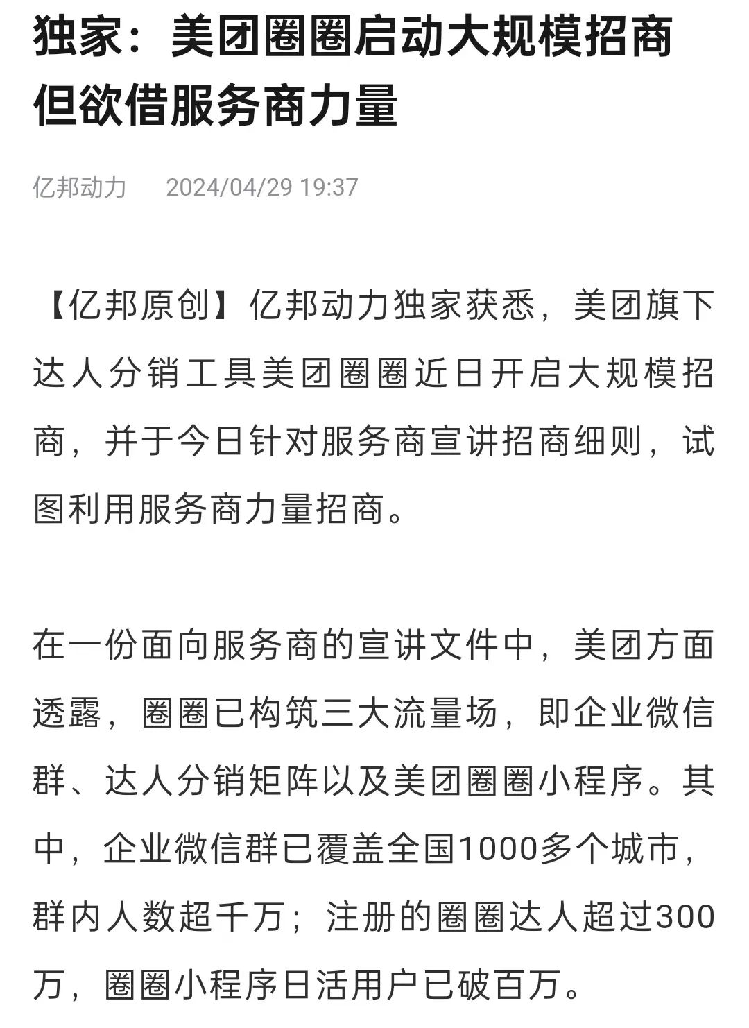 據(jù)億邦動力獨家消息,美團(tuán)旗下達(dá)人分銷工具美團(tuán)圈圈近日開啟大規(guī)模招商,并于29日針對服務(wù)商宣講招商細(xì)則,試圖利用服務(wù)商力量招商。