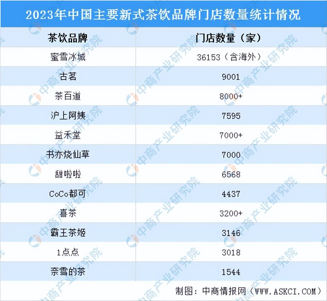 據(jù)中商產(chǎn)業(yè)研究院統(tǒng)計,2023年我國新式茶飲品牌門店數(shù)量排在前十的品牌為:蜜雪冰城、古茗、茶百道、滬上阿姨、益禾堂、書亦燒仙草、甜啦啦、CoCo都可、喜茶、霸王茶姬、1點點、奈雪的茶。