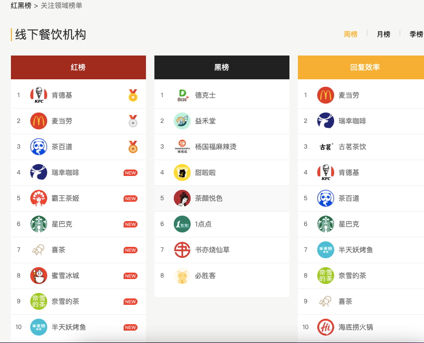 據(jù)“黑貓投訴”官網(wǎng)顯示,線下餐飲機構(gòu)的紅、黑榜中,奶茶品牌占據(jù)大多數(shù)位置。紅榜前十名中,7家為茶飲品牌,包括茶百道、瑞幸、霸王茶姬、星巴克、喜茶等;8家黑榜企業(yè)中,5家為茶飲品牌,包括益禾堂、甜啦啦、茶顏悅色、一點點、書亦燒仙草。