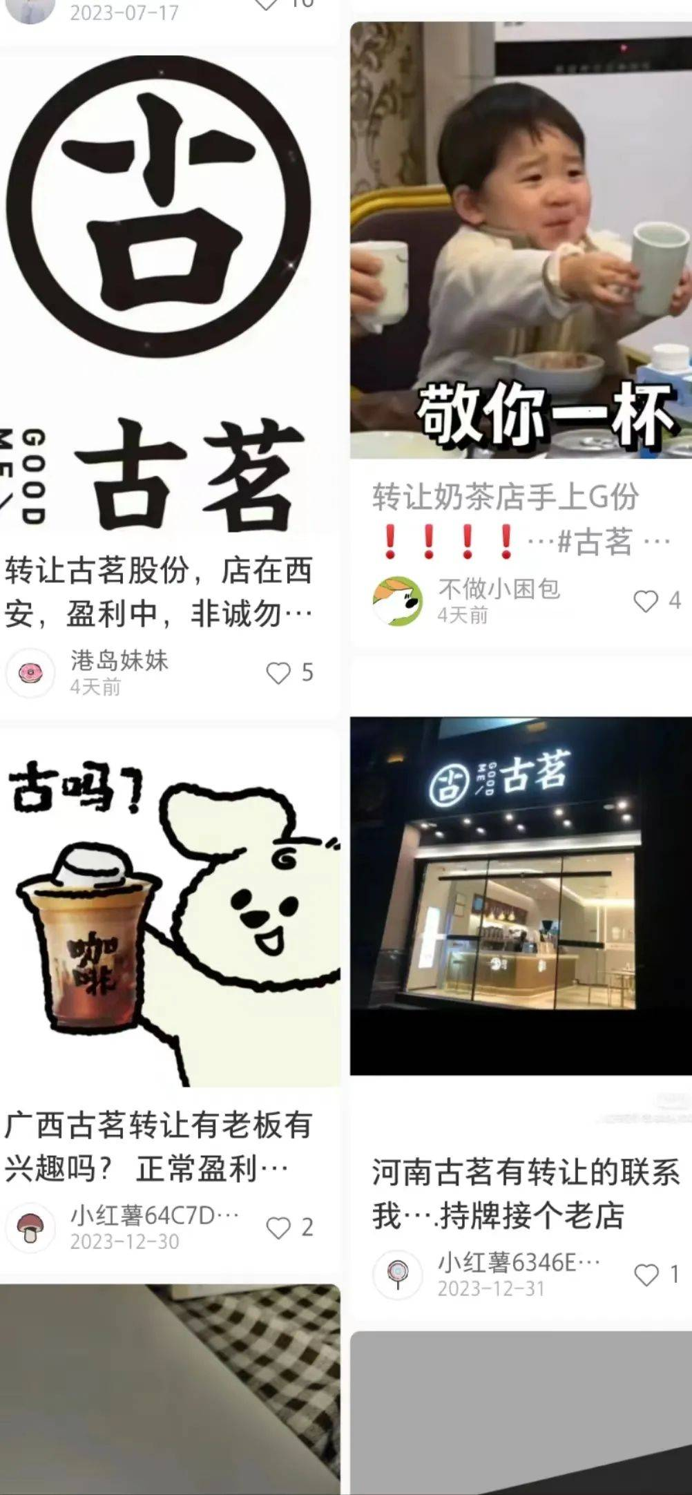 小紅書上還有多位網(wǎng)友發(fā)布轉(zhuǎn)讓古茗店鋪的帖子,所轉(zhuǎn)店鋪分別位于陜西、廣西、福建等地。