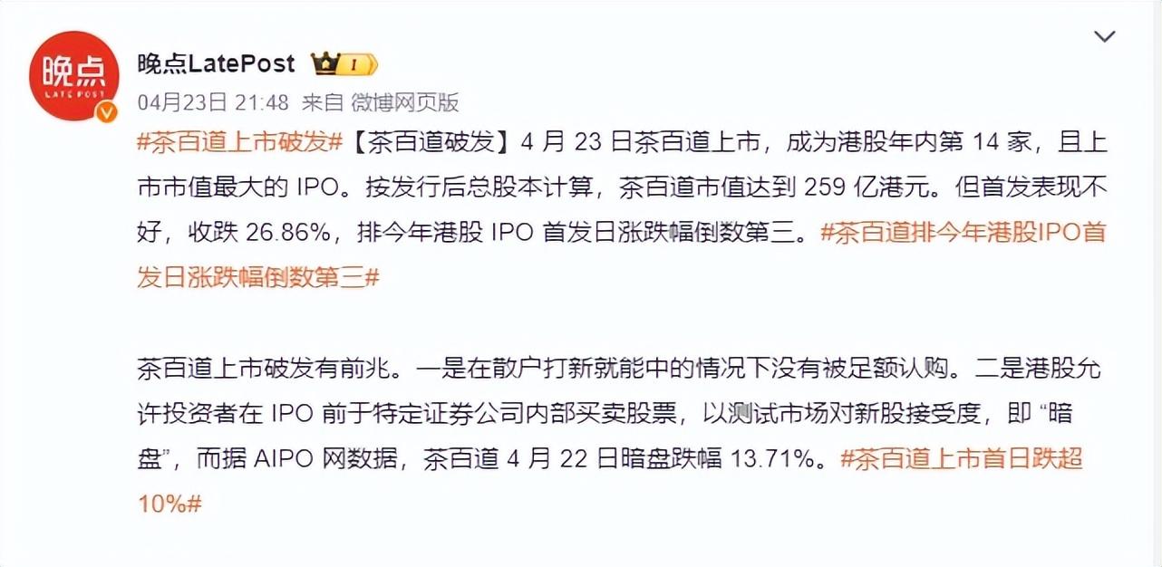 實際上,對于茶百道的破發(fā)和大跌,有行業(yè)人士早已預料到,因為在茶百道新股認購時,公開發(fā)售市場散戶打新熱情不高,甚至出現(xiàn)未足額認購情況。