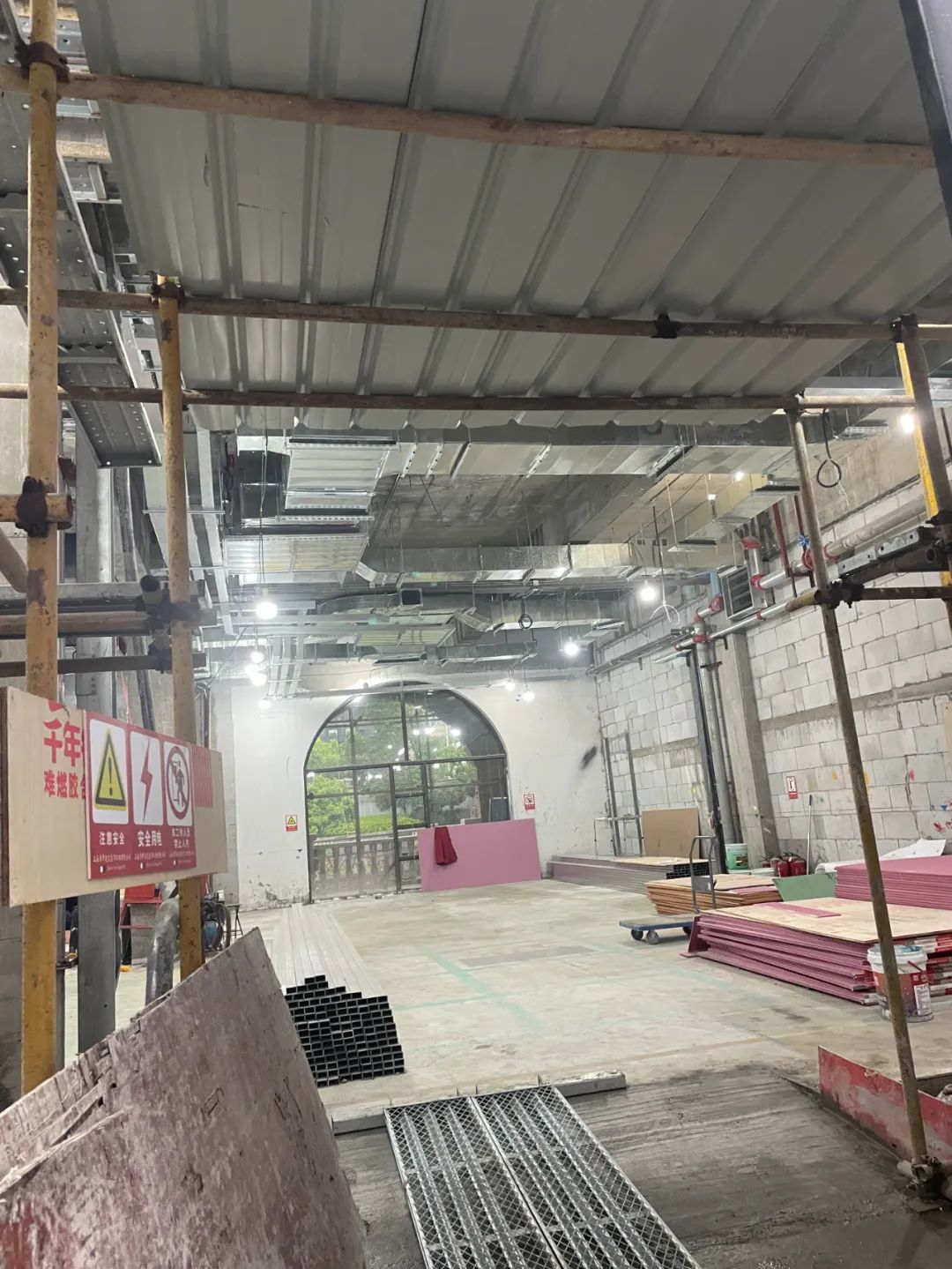 4月30日早上在現(xiàn)場看到的情況來看,街區(qū)大部分圍擋已經(jīng)上了品牌logo,從部分品牌開著的門往里看,可以發(fā)現(xiàn),門店裝修還在較初期階段,大多都還是毛坯狀態(tài);也有門店內(nèi)有工人在清理建筑垃圾;極少數(shù)已經(jīng)在裝消防通風(fēng)系統(tǒng)。