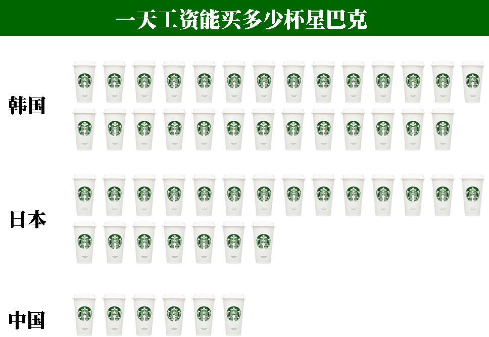 之前國際勞工組織(ILO)做了全球用戶一天工資能買多少杯星巴克的調(diào)查,結(jié)果顯示:按照日本的平均工資計算,一天可以喝21杯,在韓國達到了27杯,而在中國只有6杯。