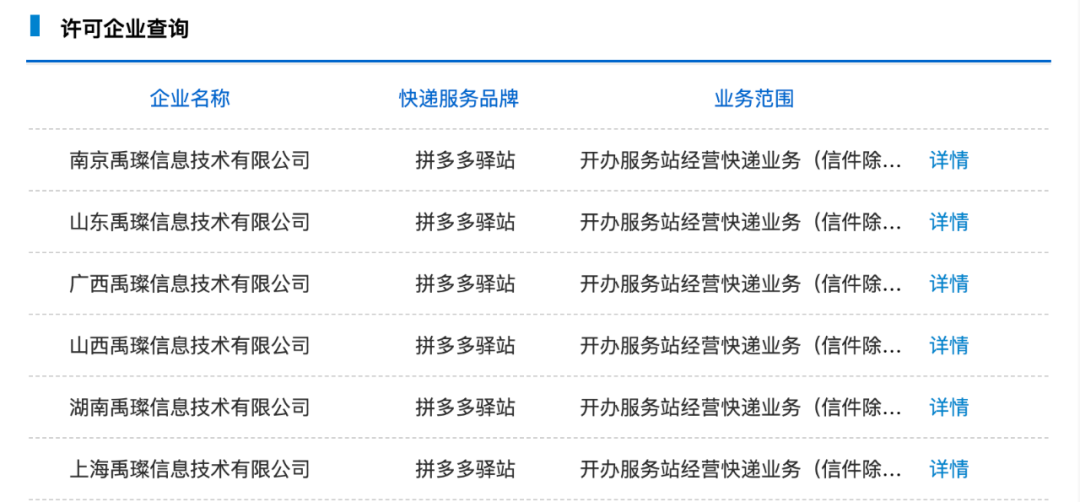 此外,除了上海,拼多多旗下注冊(cè)的南京禹璨信息技術(shù)有限公司、山東禹璨信息技術(shù)有限公司、廣西禹璨信息技術(shù)有限公司、山西禹璨信息技術(shù)有限公司、湖南禹璨信息技術(shù)有限公司也已經(jīng)接連拿下湖南(長(zhǎng)沙、郴州、衡陽(yáng))、廣西(南寧)、江蘇(徐州、無(wú)錫、南京)、山西(晉中)、山東(濱州、淄博、濟(jì)南)等地的快遞驛站經(jīng)營(yíng)許可證。