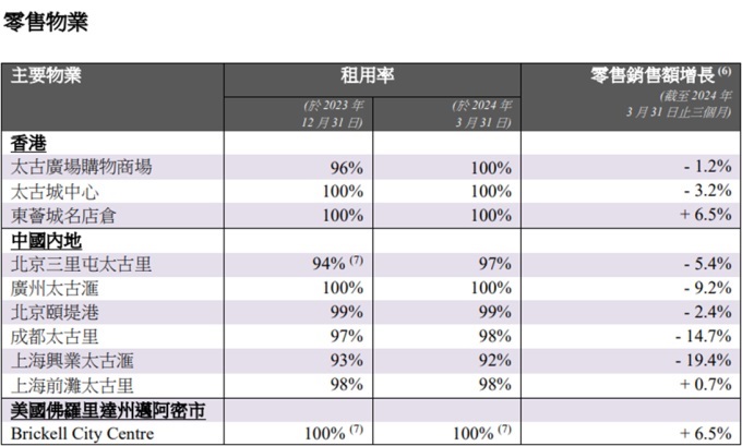 兩大主力--廣州太古匯出租率維持100%,零售銷售額下跌9.2%;成都太古里出租率升至98%,零售銷售額下跌14.7%。