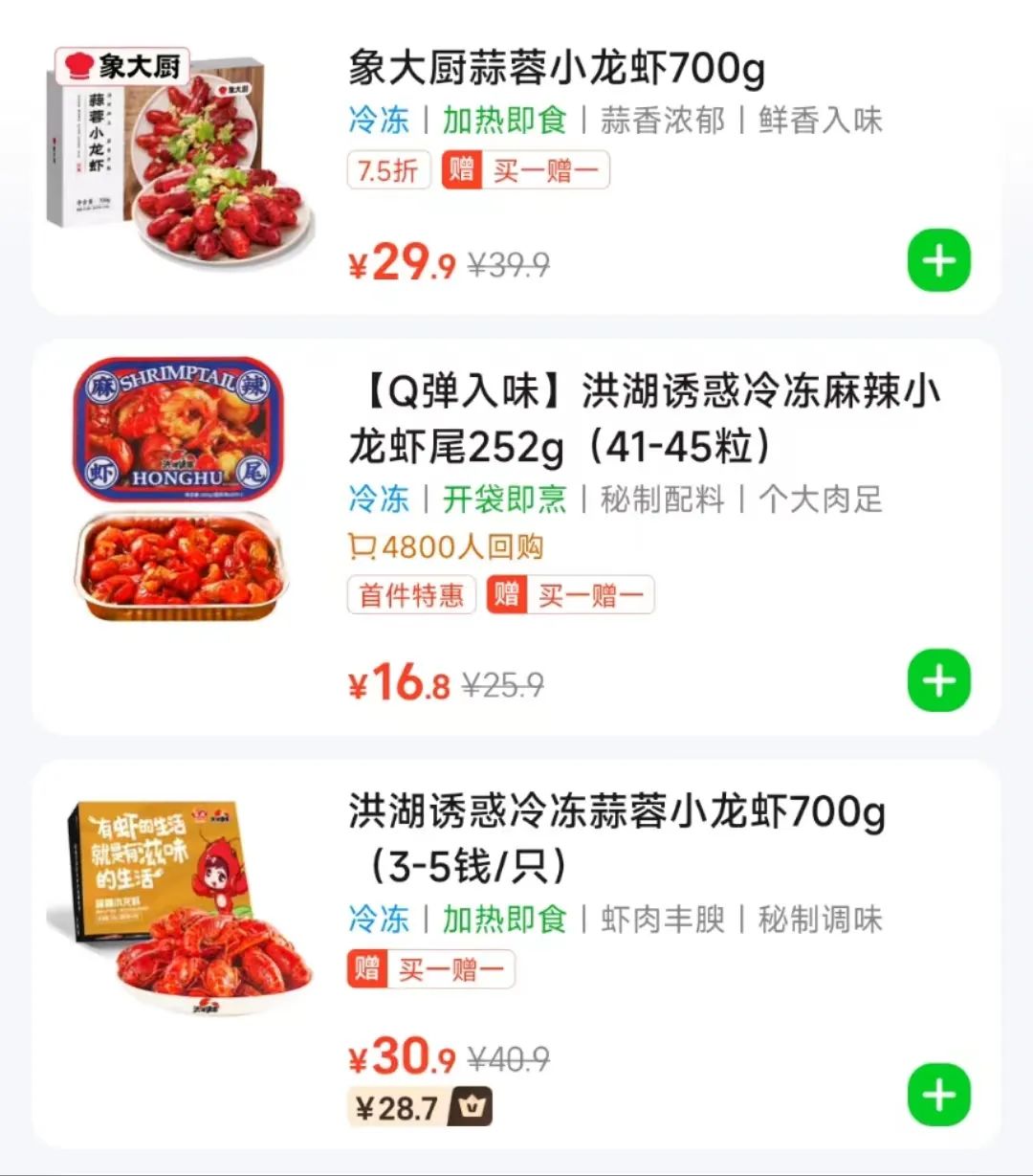 除了同行的競(jìng)爭(zhēng)外,電商渠道售賣的預(yù)制小龍蝦也對(duì)小龍蝦店的生意造成了一定沖擊。比如美團(tuán)線上生鮮購物平臺(tái)“小象超市”,其售賣的洪湖誘惑冷凍麻辣小龍蝦(3-5錢規(guī)格)為29.9元1.4斤,約21.4元/斤,象大廚嗨聊蝦4-6錢750g的小龍蝦蝦賣26.8元,約17.9元/斤,這類小龍蝦價(jià)格相對(duì)便宜、購買方便,成為不少消費(fèi)者吃蝦的選擇。