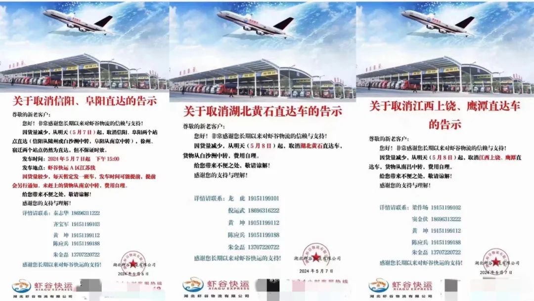 其表示,5月7日以來,湖北蝦谷物流公司接連發(fā)布多條告示,取消河南信陽、安徽阜陽、湖北黃石、江西上饒、鷹潭的站點(diǎn)直達(dá)班車,改為從附近站點(diǎn)中轉(zhuǎn)。比如,信陽的貨物改為從隨州或白沙洲中轉(zhuǎn),阜陽則改為從南京中轉(zhuǎn)。