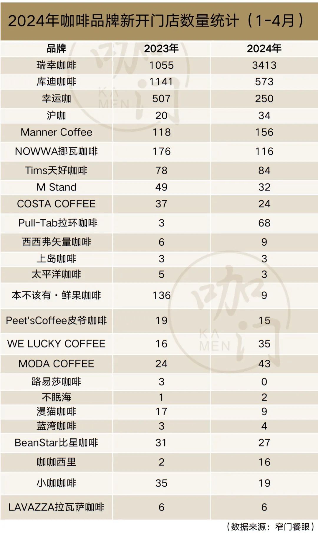 而根據(jù)咖門(mén)統(tǒng)計(jì),今年1至4月,除了瑞幸咖啡,窄門(mén)餐眼上擁有百店以上的20+咖啡品牌新開(kāi)店數(shù)量總計(jì)為1537家,相較于去年同期的2436家,減少了899家。
