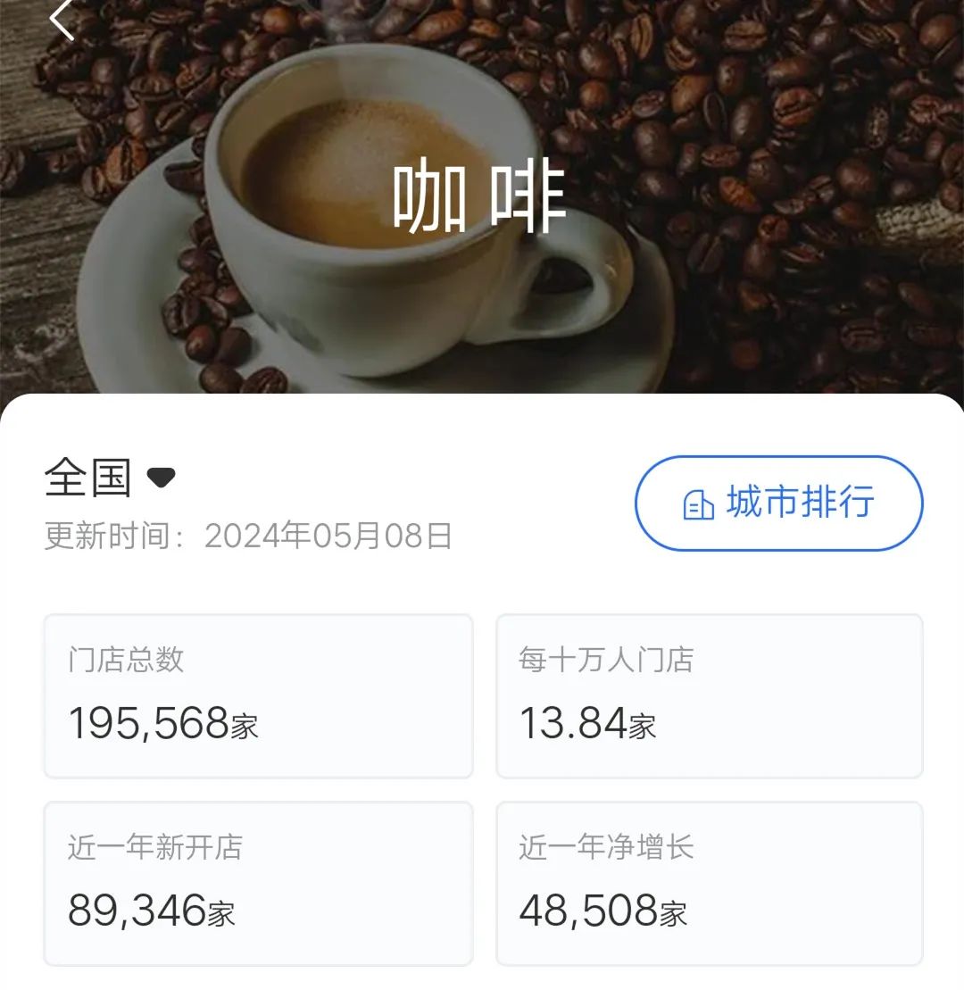 窄門(mén)餐眼的數(shù)據(jù)顯示 (截至4月8日) ,咖啡行業(yè)近一年新開(kāi)店89346家,凈增長(zhǎng)48508家。