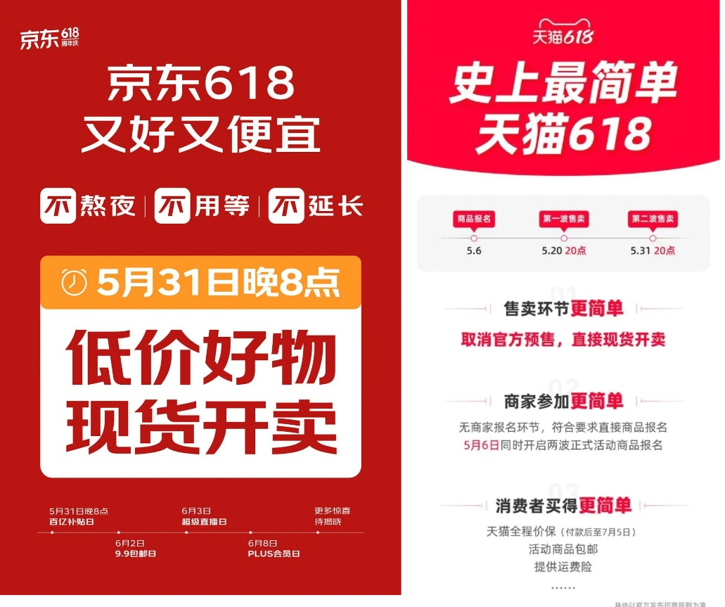 或許正因為看到了來自多方的不滿,今年618大促前,淘寶、京東不約而同地宣布取消預(yù)售機制。其中淘寶招商文件顯示,取消預(yù)售的淘寶將618活動提前到了4月下旬,其中4月下旬到5月中旬為“前站”,5月中下旬進(jìn)入618第一波,5月31日晚上八點到6月20日是第二波。