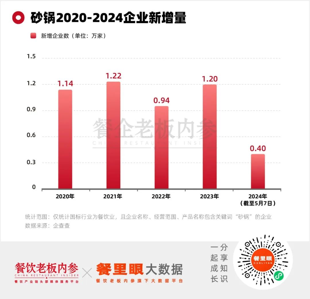 無論是從2020年開始,按照年度新增量進(jìn)行分析;還是從2023年1月開始,盤點(diǎn)過去十幾個(gè)月的砂鍋新增門店數(shù),砂鍋新增企業(yè)量都是那么不溫不火。在企業(yè)新增數(shù)據(jù)層面分析,難以看到“翻紅”的例證。