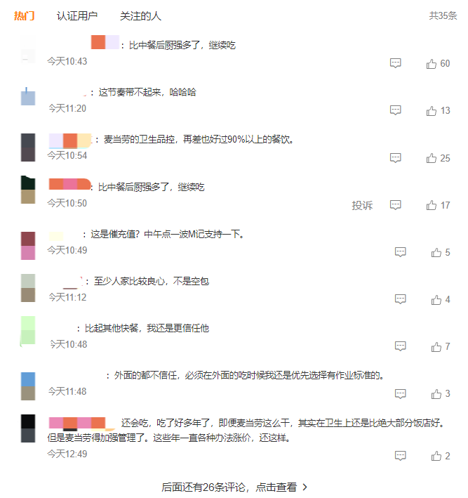另一邊,“麥當(dāng)勞給過期食材換標(biāo)簽續(xù)命”登上熱搜后,《新京報》發(fā)布了一個“食品安全問題頻發(fā)你還會吃麥當(dāng)勞嗎?”的小調(diào)查,而評論區(qū),多位網(wǎng)友表示,“繼續(xù)吃”,“麥當(dāng)勞的衛(wèi)生品控,再差也好過90%以上的餐飲”,“比起其他快餐,我還是更信任他”……