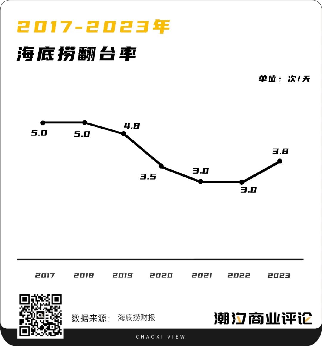 即便是海底撈巴奴等頭部火鍋選手,也能感受到餐飲業(yè)壓力。相對于疫情三年,2023年海底撈的翻臺率有所提升,但如果拋開這三年,海底撈的翻臺率則總體呈現(xiàn)下降趨勢。而單純從翻臺率來看的話,海底撈的客人正在變少。(圖示:2017年至2019年,海底撈翻臺率分別5.0次/天、5.0次/天、4.8次/天。2020年到2023年,海底撈翻臺率分別為3.5次/天、3.0次/天、3.0次/天、 3.8次/天,建議柱狀+曲線)