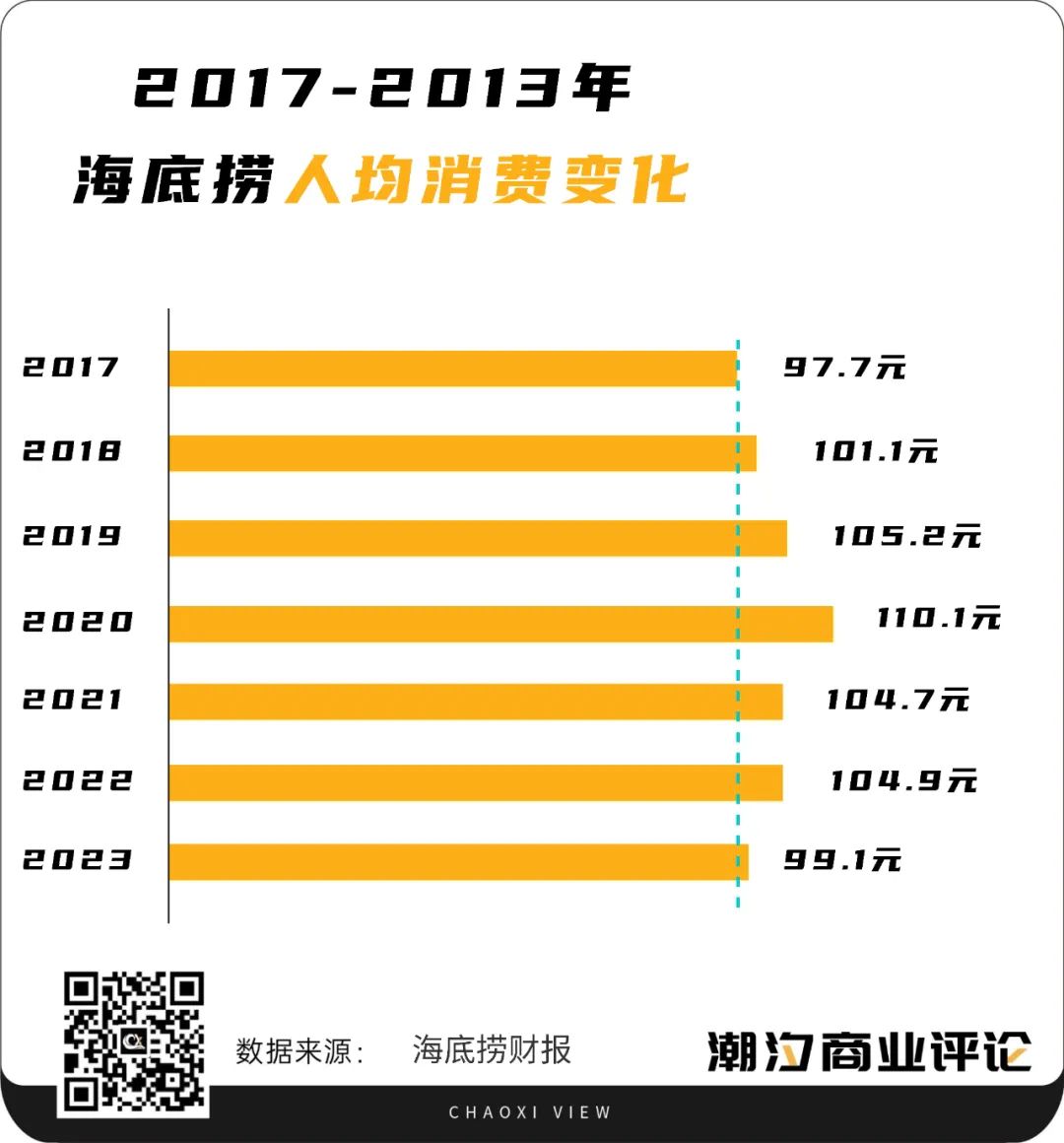 而在人均消費上,2023年海底撈人均消費水平跌破百元達(dá)到99.1元。不僅從2022年的104.9元降到了2023年的99.1元。而且值得注意的是,較于疫情期間2020年的人均消費110元,2023年海底撈人均消費下降大約10%。