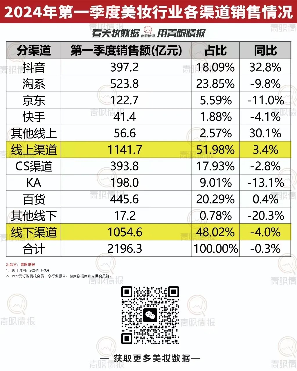 而從各個(gè)渠道來(lái)看,今年一季度,線上渠道中,銷售額度最大的仍為淘系,銷售額為523.8億元,占比為23.85%,同比下降了9.8%;而抖音則是排在第二位,銷售額為397.2億元,占比為18.09%,同比增幅為32.8%,是各個(gè)渠道中增幅最大的。