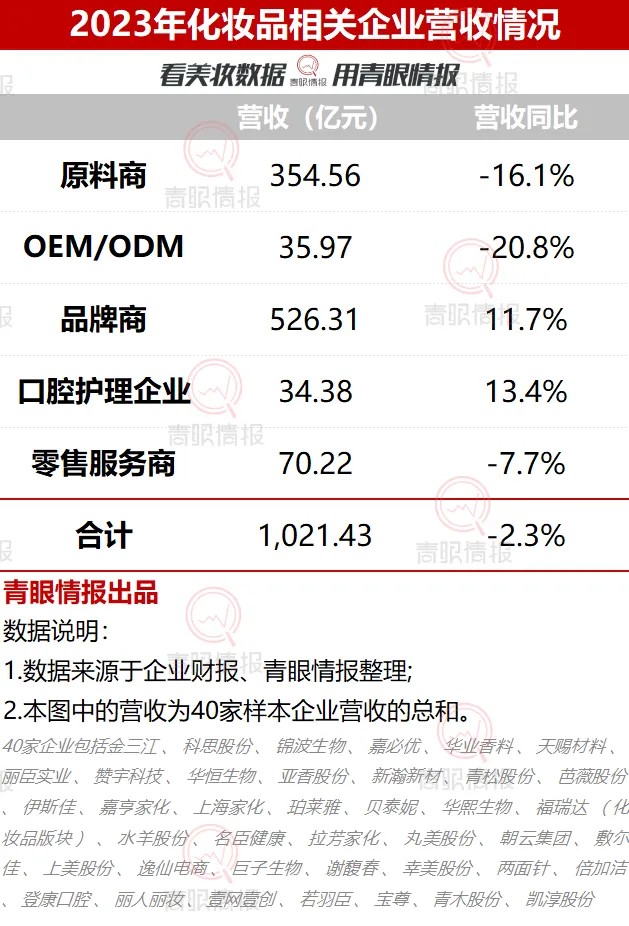 承壓明顯,寒氣逼人。根據(jù)青眼情報(bào)統(tǒng)計(jì)的國(guó)內(nèi)40家上市美妝相關(guān)企業(yè)的數(shù)據(jù)顯示,2023年,國(guó)內(nèi)化妝品相關(guān)上市企業(yè)總營(yíng)收為1021.43億元,同比下滑2.3%。其中,原料商企業(yè)的總營(yíng)收為354.56億元,同比下降了16.1%,OEM/ODM類的企業(yè)營(yíng)收則為35.97億元,營(yíng)收更是同比下降了20.8%。品牌商和口腔護(hù)理企業(yè)則是分別同比增加了11.7%和13.4%,增速放緩。