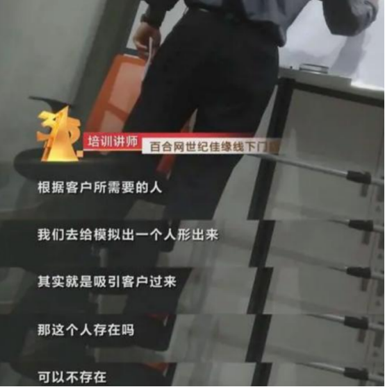 今年央視3·15晚會(huì)曝光,世紀(jì)佳緣、珍愛網(wǎng)等多家婚戀平臺(tái)有“紅娘”利用焦慮收割消費(fèi)者的行為。曝光視頻顯示,世紀(jì)佳緣的講師在向員工傳授銷售技巧時(shí),會(huì)教員工模擬一個(gè)虛擬對(duì)象來滿足客戶的期待,但這樣一個(gè)理想的征婚對(duì)象并不一定存在。