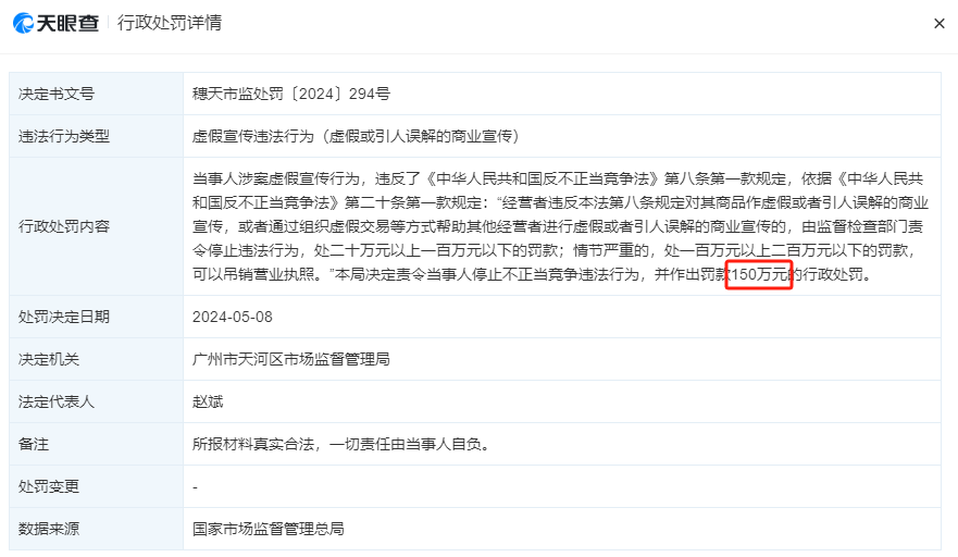 5月8日,世紀(jì)佳緣被曝光門店所屬公司“北京花千樹信息科技有限公司廣州天河分公司”被廣州市天河區(qū)市場監(jiān)督管理局罰款150萬元,依據(jù)與珍愛網(wǎng)類似。