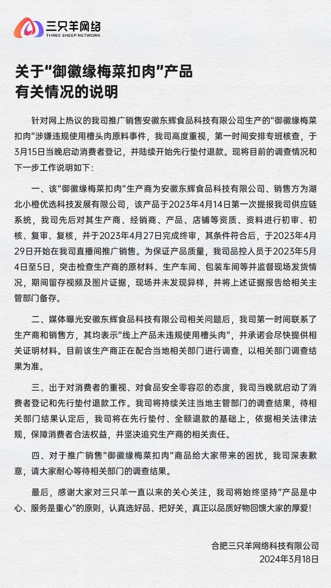 被3·15曝光后,東方甄選和三只羊網(wǎng)絡(luò)都于3月18日公開道歉。根據(jù)公告,東方甄選稱將為消費(fèi)者先行墊付退款,若廠商不能提供相關(guān)證明,進(jìn)一步墊付三倍賠償;三只羊則表示已啟動(dòng)墊付退款工作,未提到三倍賠償。