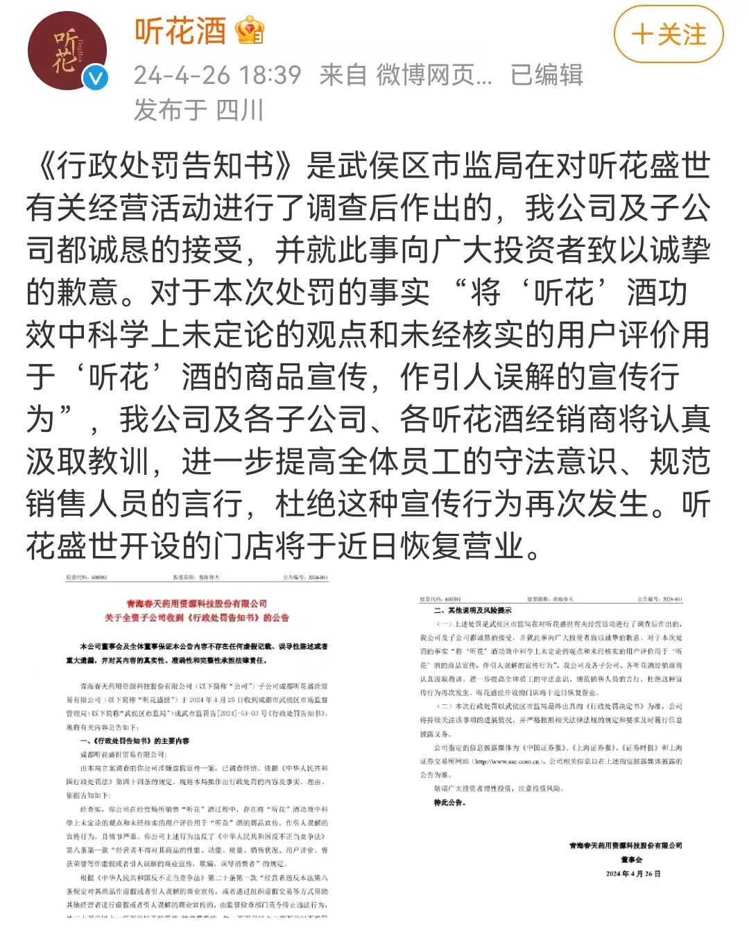 4月26日,青海春天發(fā)布公告稱,全資子公司成都聽花盛世貿(mào)易有限公司收到四川省成都市武侯區(qū)市場監(jiān)管局的《行政處罰告知書》。書中稱聽花盛世在經(jīng)營場所銷售聽花酒過程中,存在將聽花酒功效中科學(xué)上未定論的觀點(diǎn)和未經(jīng)核實(shí)的用戶評(píng)價(jià)用于宣傳,作引人誤解的宣傳行為,且情節(jié)嚴(yán)重,違反《反不正當(dāng)競爭法》,擬對(duì)其罰款180萬元。