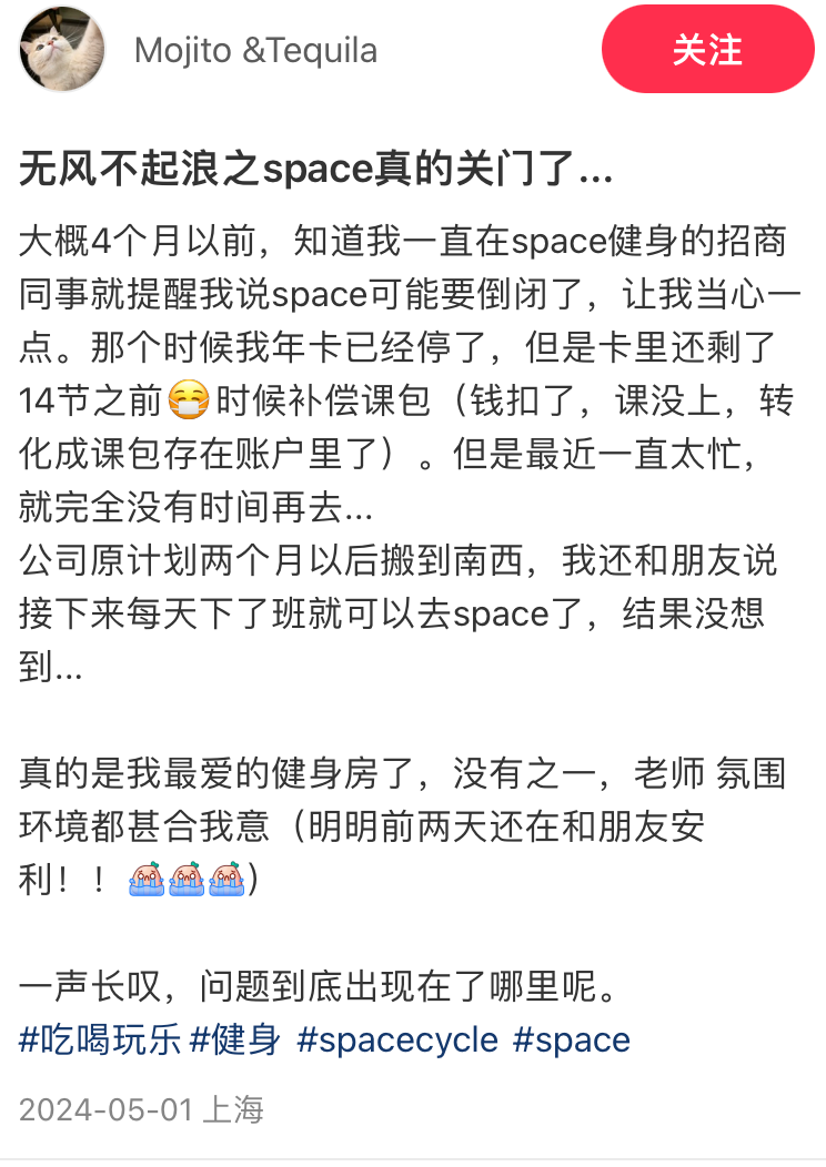 此外,有網(wǎng)友表示,“在大概4個月以前,知道我一直在Space健身的招商同事就提醒我說Space可能要倒閉了,讓我當心一點!