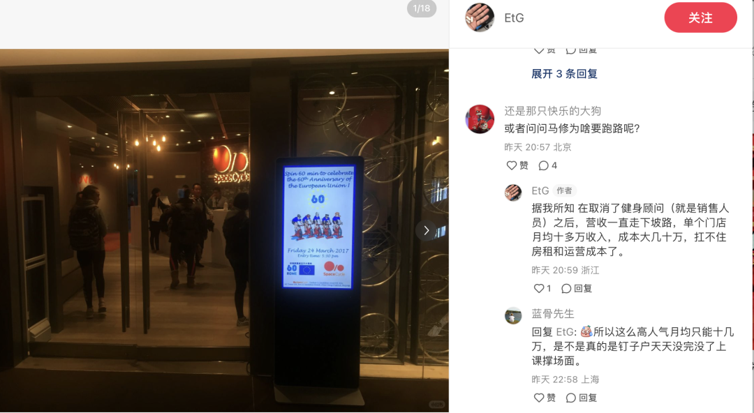 在某社交媒體上,自稱Space第一任市場總監(jiān)的網(wǎng)友透露,“據(jù)我所知,在取消了健身顧問(就是銷售人員)之后,營收一直走下坡路,單個門店月均十多萬收入,成本大幾十萬,扛不住房租和運營成本了!