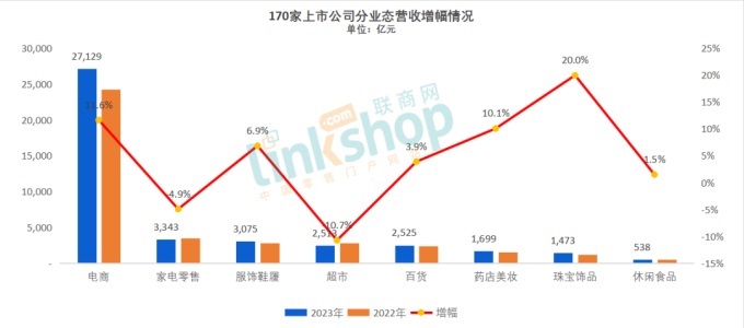 1、從業(yè)態(tài)營收增幅來看,超市業(yè)態(tài)總體跌幅達到-10.7%,表現(xiàn)非常不理想。
