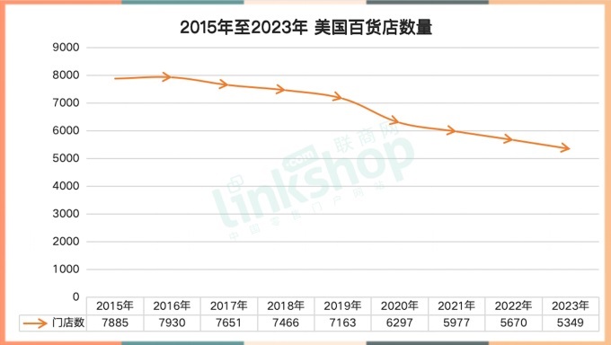 據(jù)專業(yè)數(shù)據(jù)機(jī)構(gòu)Statista,自2016年以來,美國百貨店的數(shù)量逐年遞減,從2016年的7930家降至2023年的5349家。也就是說,在七年時間里,有2581家百貨店從美國零售商業(yè)版圖中銷聲匿跡,減少率達(dá)到32.56%。