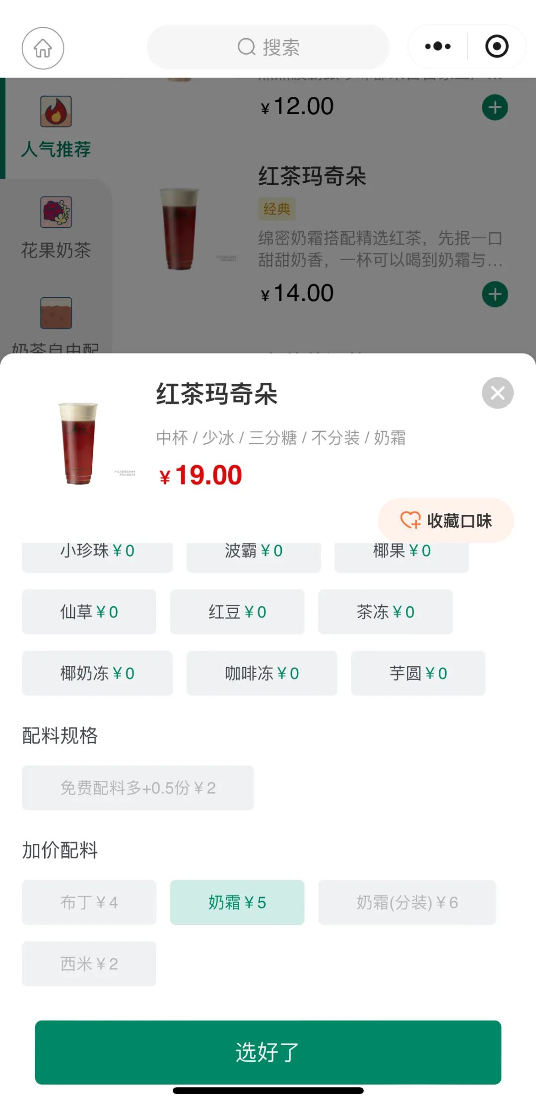 以熱門產(chǎn)品“四季奶青”“波霸奶茶”“紅茶瑪奇朵”為例,定位廣州地區(qū)的門店點單可以看到,四季奶青和波霸奶茶售價均從原來的11元變?yōu)榱?2元,紅茶瑪奇朵則從原本的13元上漲到了14元,在此基礎(chǔ)上,如果再加上一份奶霜小料,一杯紅茶瑪奇朵的價格將會從原來的17元變成19元。