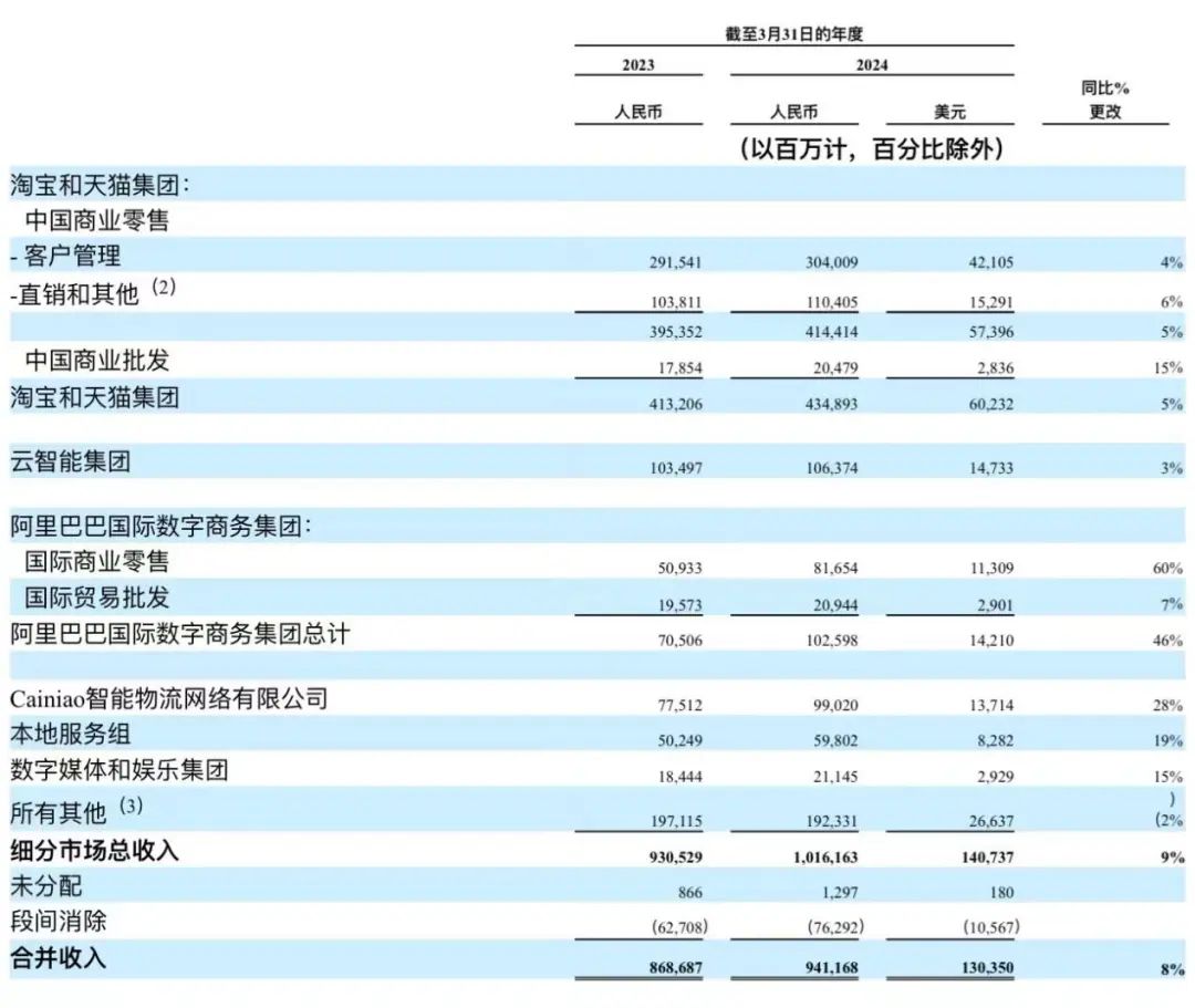 5月14日,阿里巴巴集團發(fā)布2024財年第四季度財報(自然年2024年一季度)及全年業(yè)績。財報顯示,阿里巴巴集團Q4總收入2218.74億元,同比增長7%,超市場預(yù)期;2024財年,阿里巴巴集團收入達9411.68億元,經(jīng)調(diào)整EBITA同比增長12%至1650.28億元。